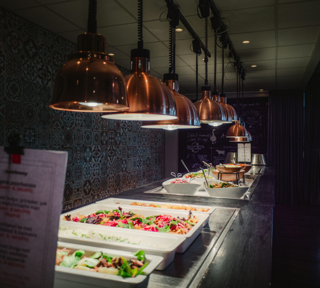 Vi erbjuder lunchbuffé där du kan välja mellan en soppa, en vegetarisk varmrätt samt en fisk och en kötträtt (alltid 4 rätter). Salladsbuffén bjuder på ca sex till åtta olika arbetade sallader samt hembakat bröd, ost och frukt. Allt för att du skall få energi att klara dagen. Till det serveras alltid kranmärkt vatten och våra vattenmaskiner med filtrerat kolsyrat eller stilla vatten finns alltid till ert förfogande.